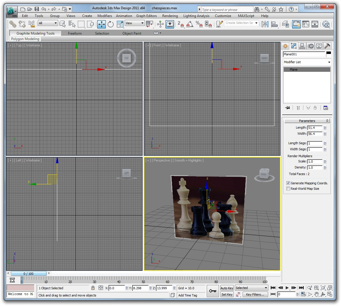 Drag the image of the two chess pieces to the desktop, then drag it to the plane to automatically apply it as a diffuse map. Note that the size of the image is 846x772. In order to avoid distortion, we go back to the plane and, in the modifier tab, set its dimensions to something that preserves the width-height ratio, like 56 x 51.