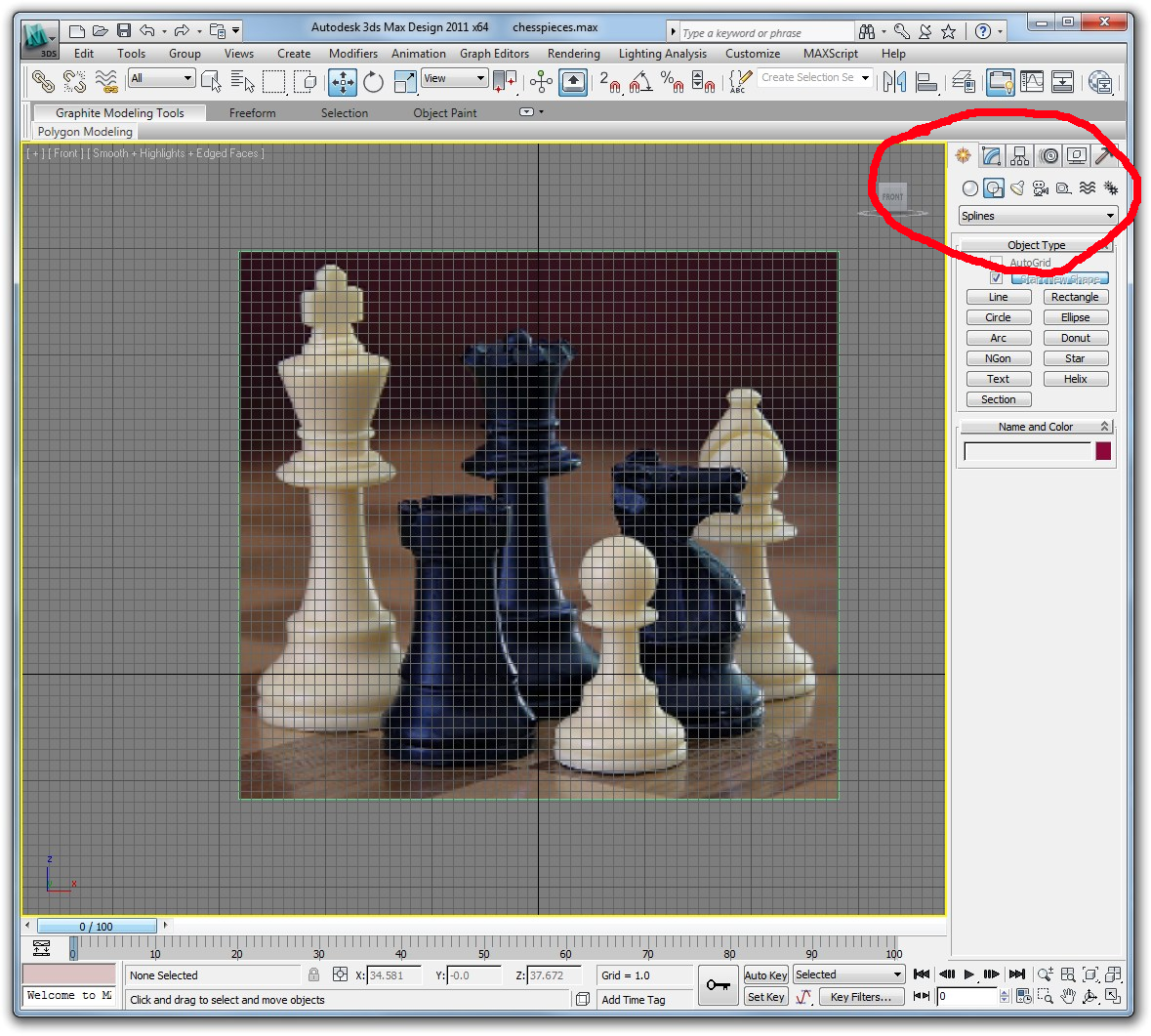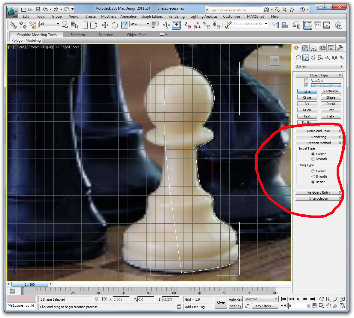 Click the line tool, and set 'Drag Type' to Bezier. Use this tool to trace half of the outline of the pawn. Left clicking creates a point,and holding down the left mouse button allows you to give the point a curve. End the shape either by left clicking on your initial point or right clicking anywhere. Being able to do smooth curves in this is one major difference between working with splines and working with vertex tools (which is what we have been doing).