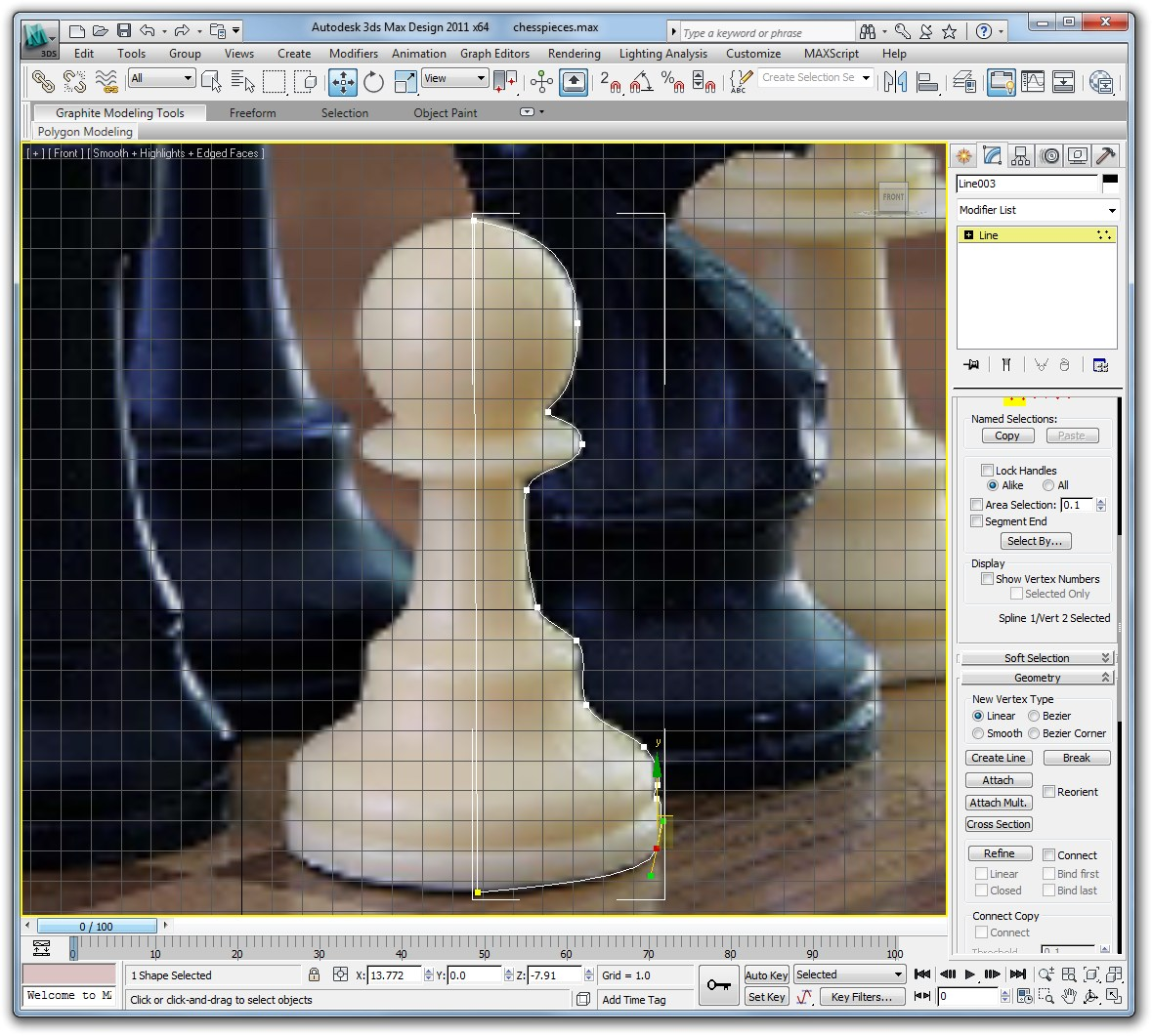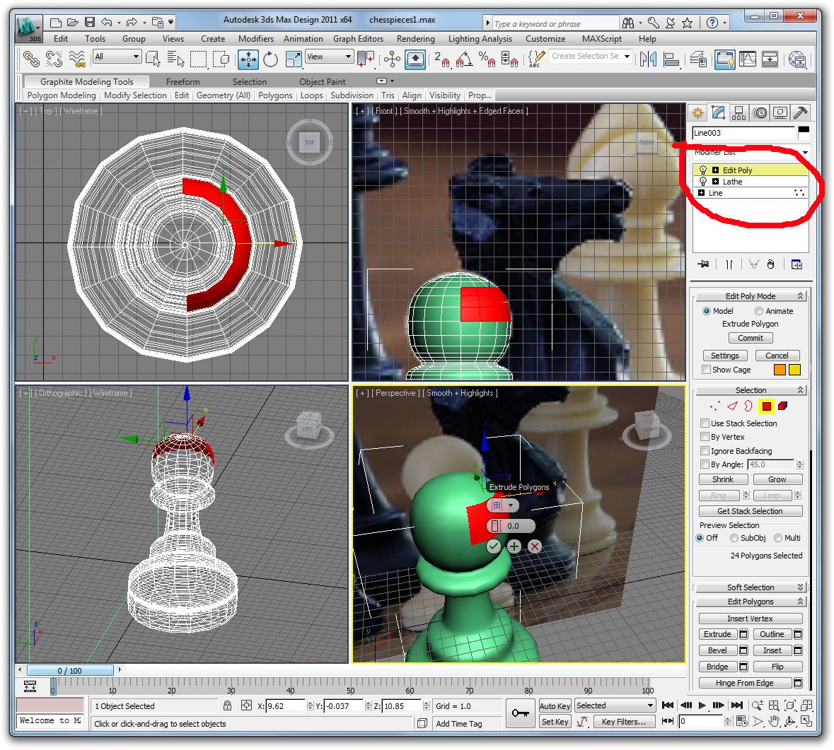 At this point you may want to further tweak the geometry or add non-symmetrical features such as the notch in the bishop. Add an editable polymodifier on top of the Lathe modifier in the stack. At this point you can use the existing tools we know how to use, such as slice, to add features. At any time you can return to the Lathe or Line levels and edit their properties. After finishing up the pawn, model two more chess piece using these procedures, in addition to the chessboard, which can be modeled as a box with the provided texture applied and UV mapped (see last week's lesson.)