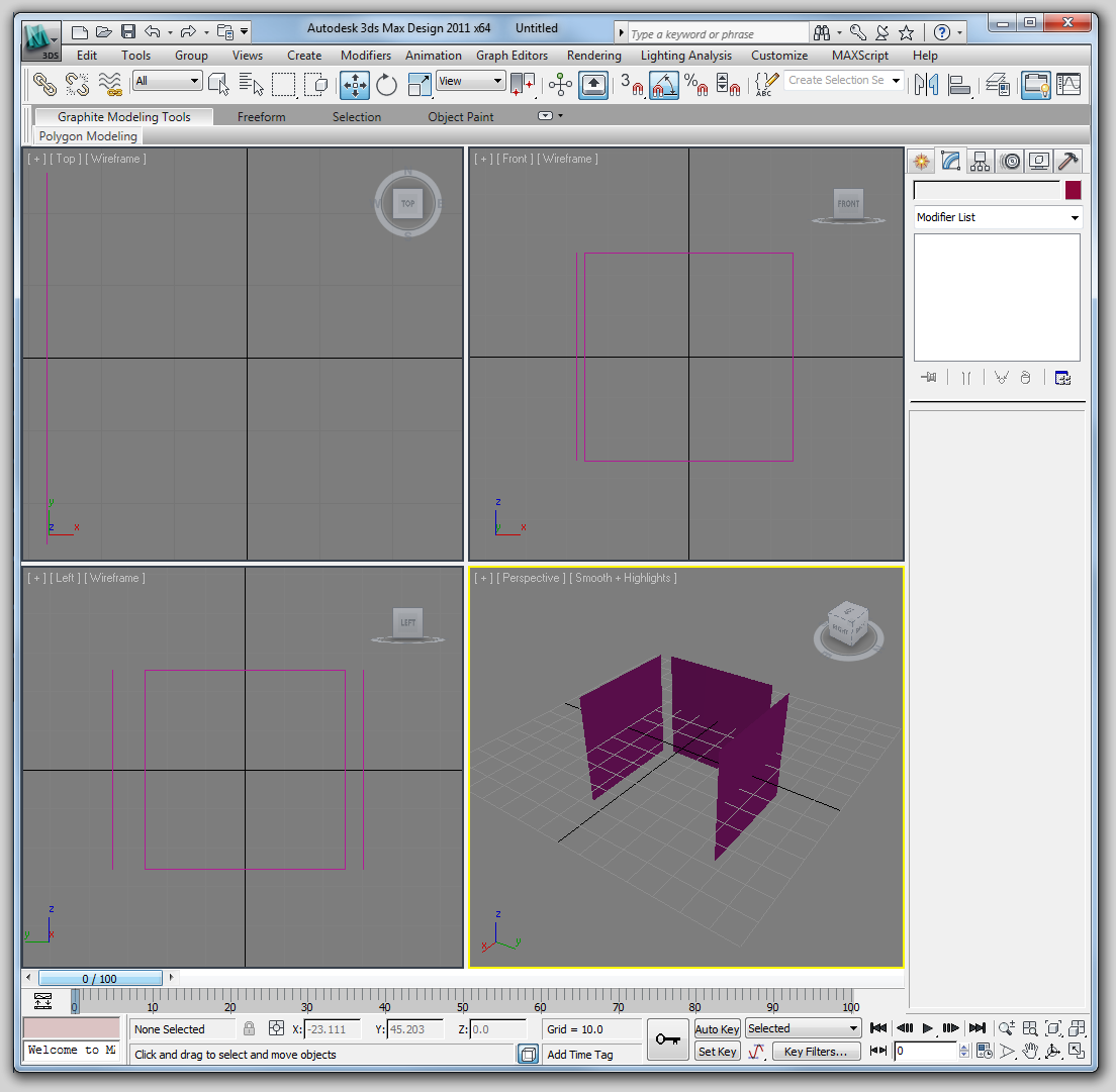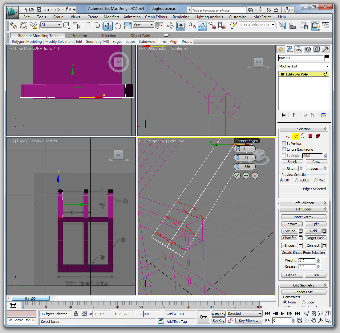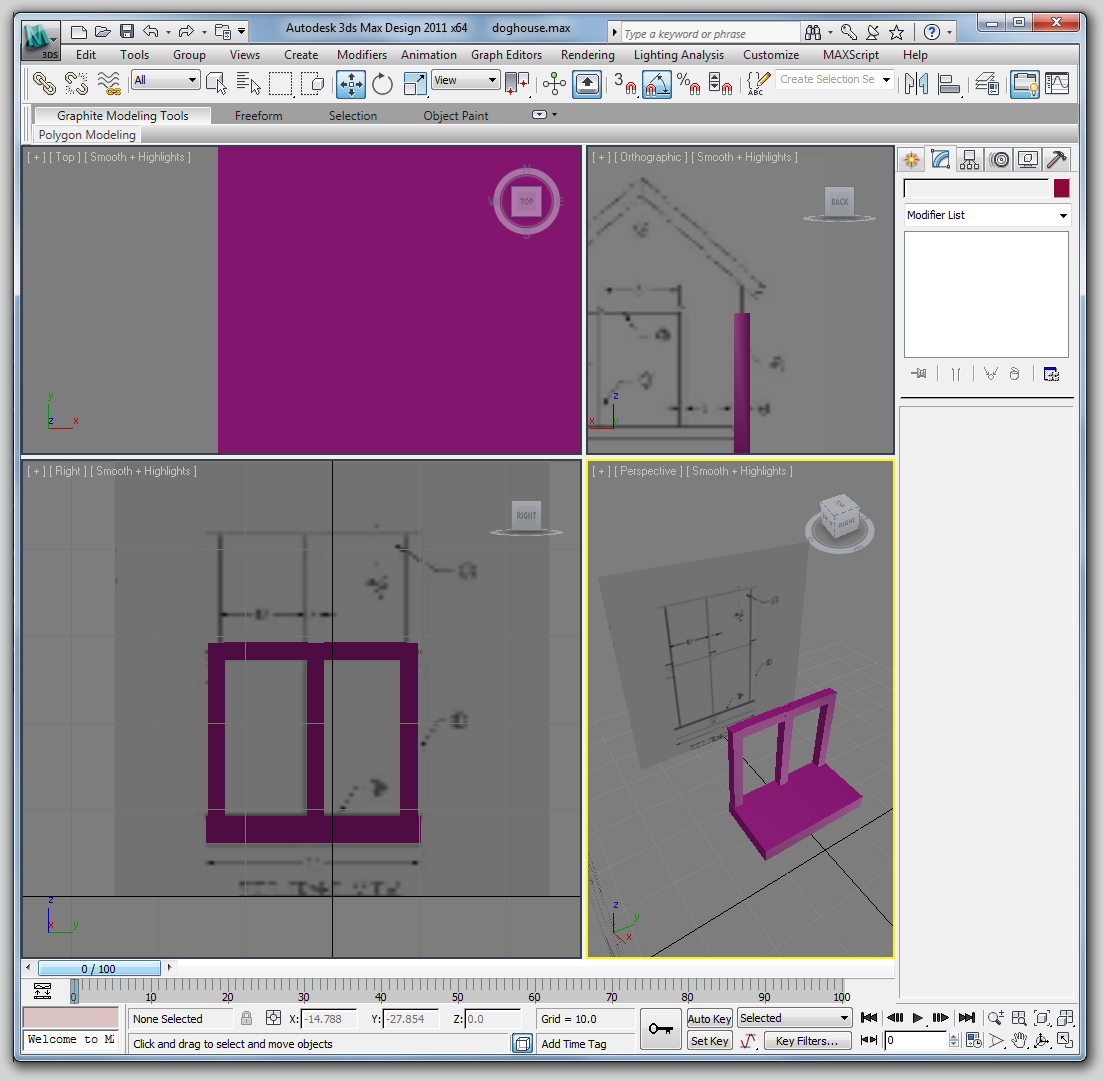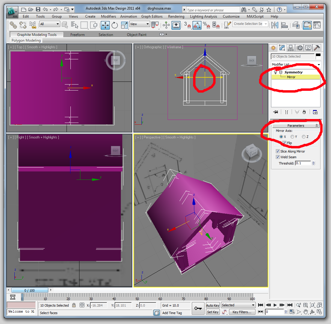 Since the house is symmetrical it makes sense to only build half of it then have MAX duplicate this. If you would like to do it this way, select half of your doghouse and add the 'Symmetry' modifier. Notice how this modifier is in italics. This is because it is applied to a group of objects. Check the 'flip' checkbox and make sure mirror axis is set to X. Then, expand the symmetry modifier in the stack and select 'Mirror'. Drag the mirror point around in a viewport until it is in a location that makes the shape you want. You can turn off this modifier by clicking the light bulb next to its name. When you are done with this model, it should have all of the detail implied by the schematic, and roughly the same proportions