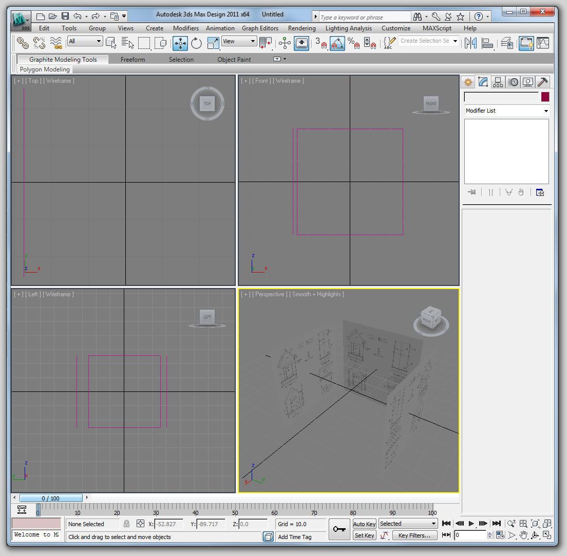 Now we are ready to begin modeling. Note that you can right click on one of the reference image planes and select 'hide selection' if it is getting in your way. Since there is not a strong reason why this model has to be one mesh, we are going to model it as a series of box primitives. We can start out with the frame. Go to a right orthographic view (do not just rotate the perspective view, as this will cause distortion) and start making boxes that follow the reference plane. If you just see wireframes in the viewport, press f3.