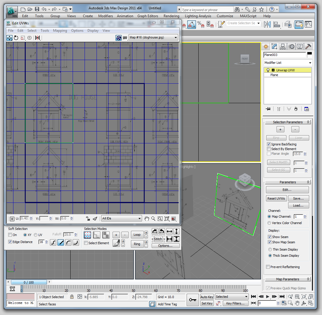 Apply the doghouse texture to each of these planes. Turn off real-world map size