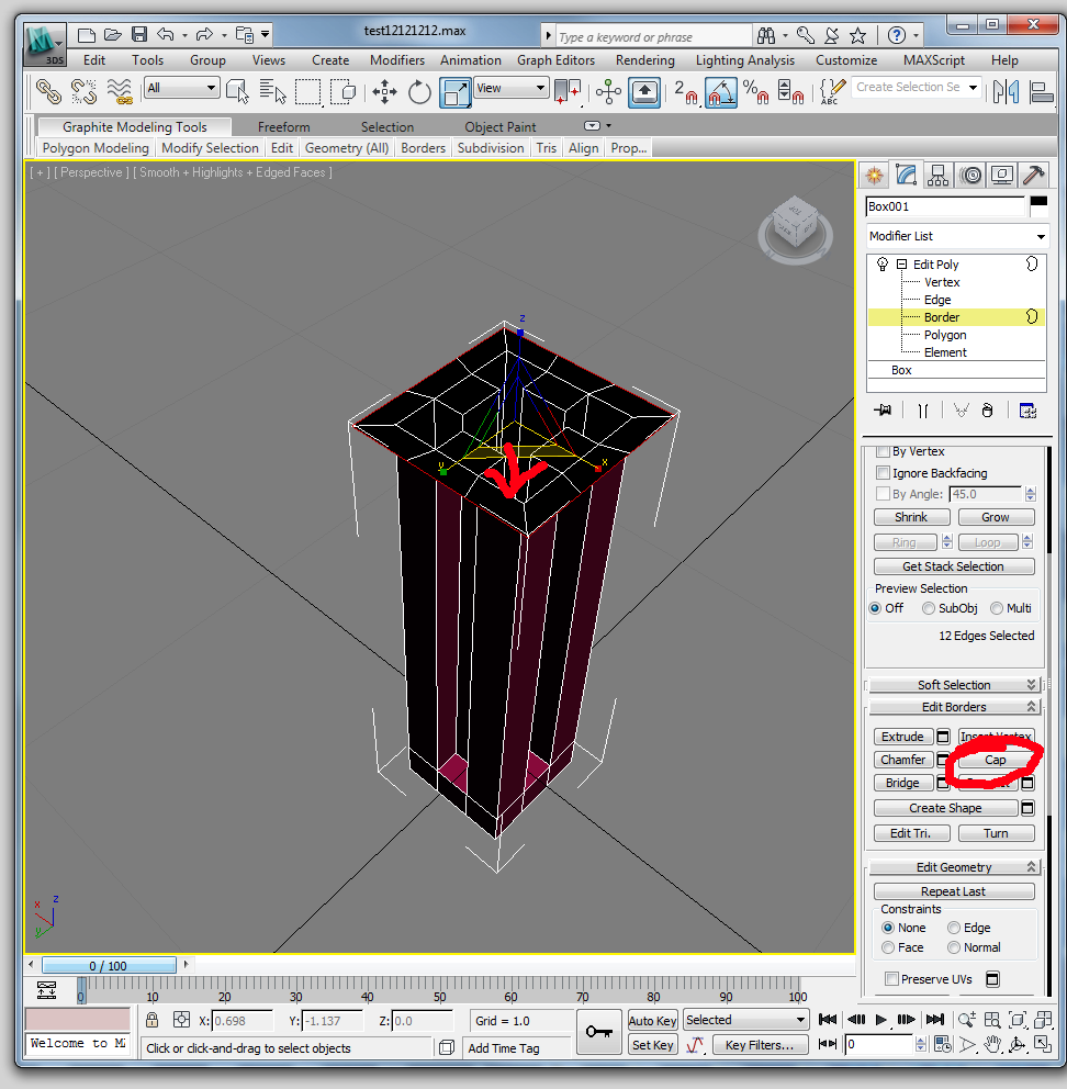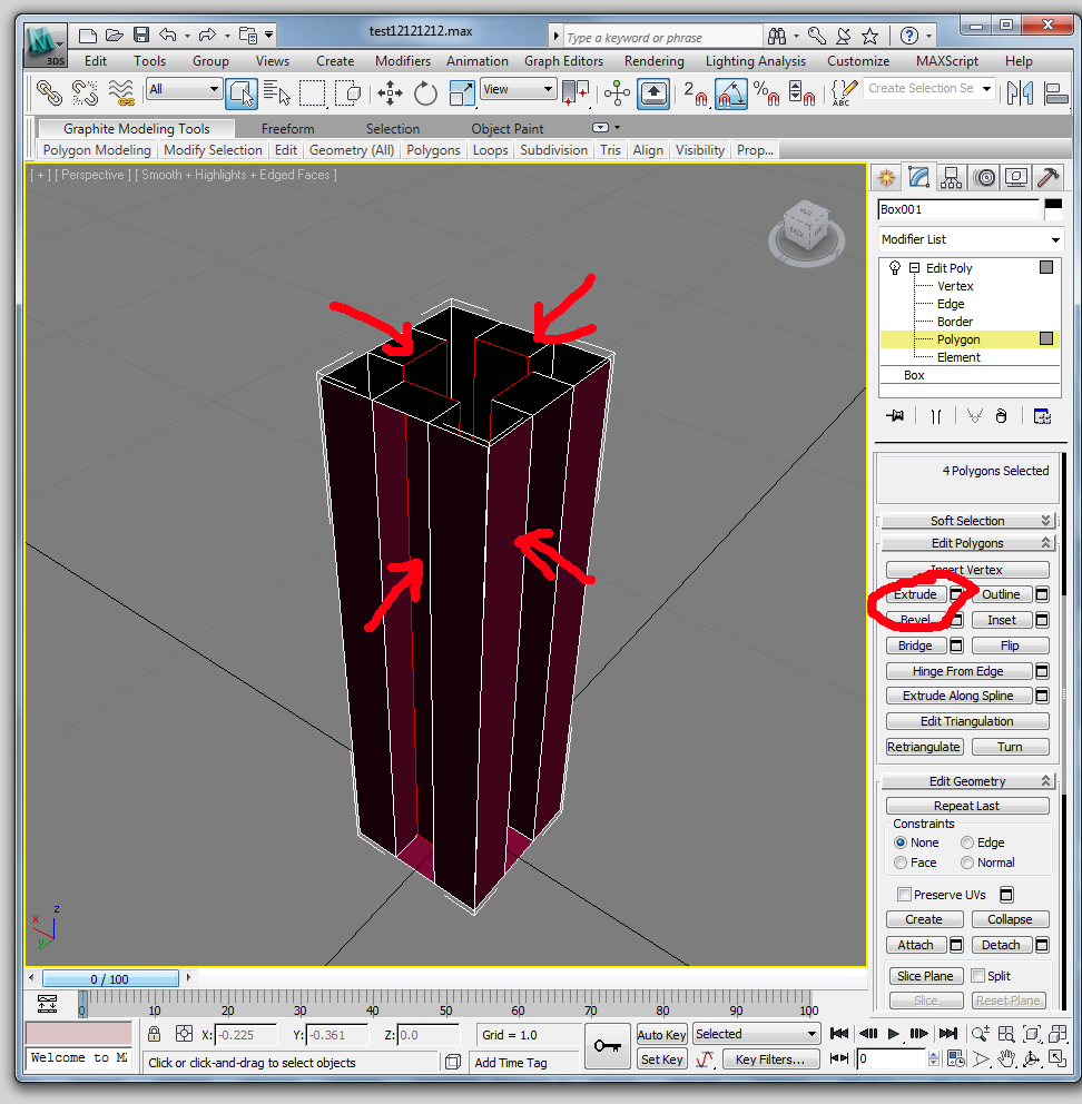 Convert the box to an editable poly, then delete the top and bottom faces. Next, extrude each of the 4 middle lateral faces with a negative value