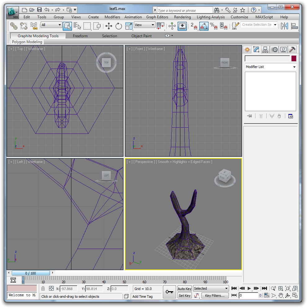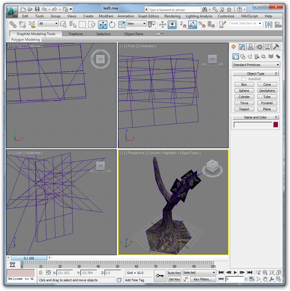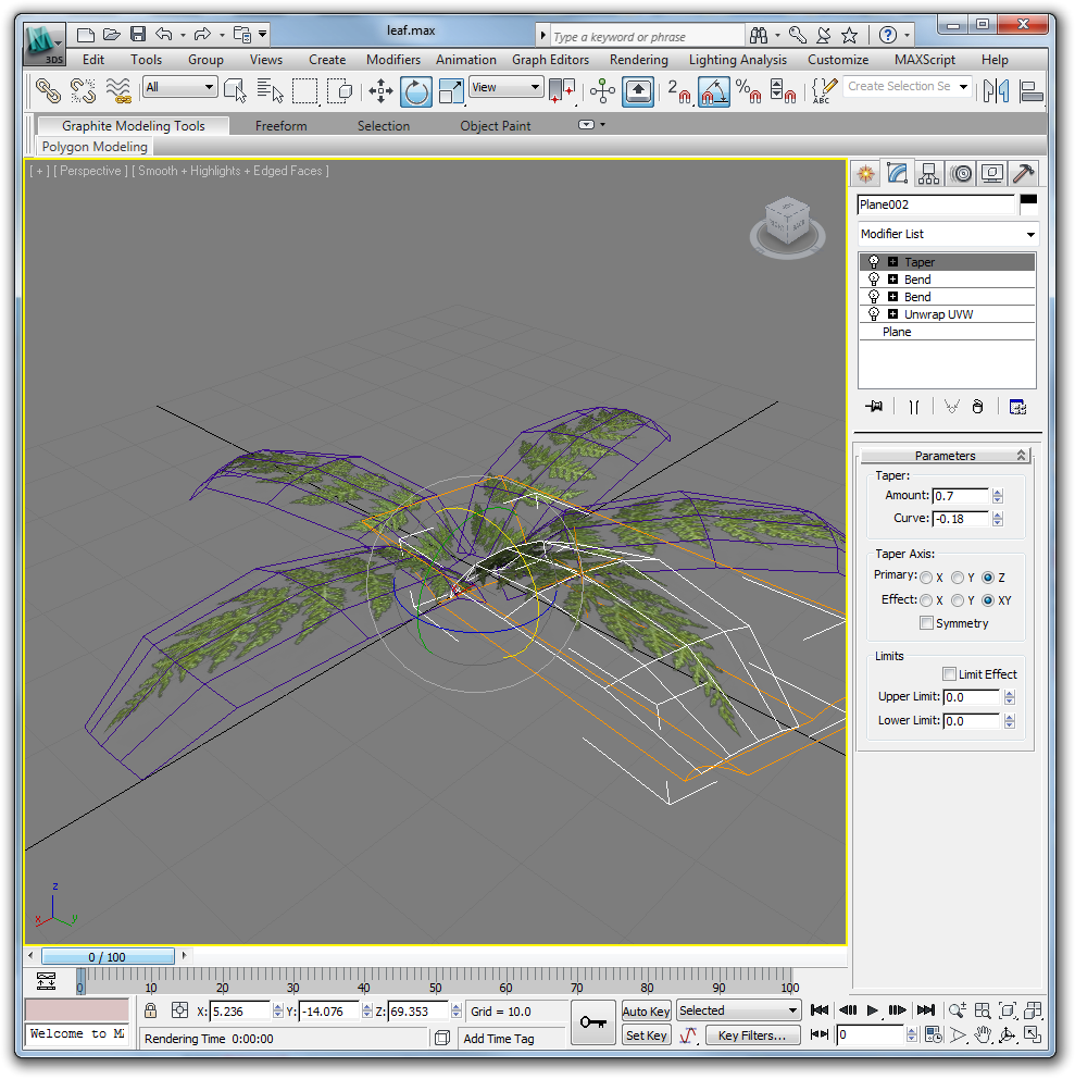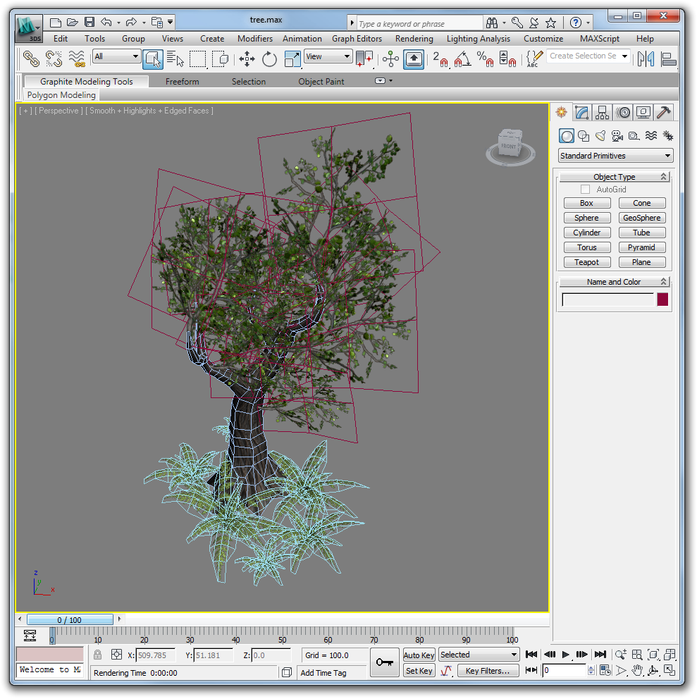 Before your tree is finished, check to make sure you have no egregious texture stretching, hard edges, and floating branches. Create a scene with the ferns and tree when you are done. Try to keep the tree as low poly as possible while still maintaing smoothness and organic nonuniformity.