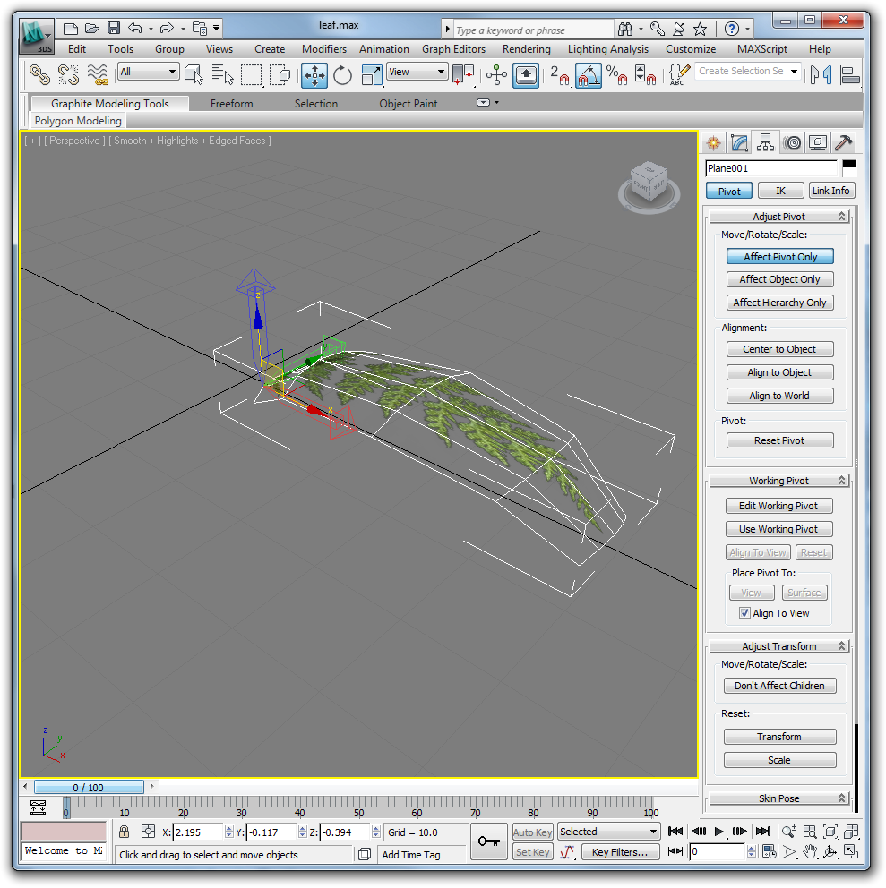 Move the pivot point of the object to one end of the fern. To do this, click the 'hierarchy' tab in the upper right, and click 'affect pivot only.' Until you click this again, or click off of the hierarchy tab, moving the gizmo will move the center point of the object.