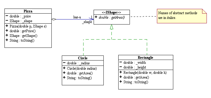 /** * A pizza has a price and a shape. */ public class Pizza { private double _price; private IShape _shape; public Pizza(double p, IShape s) { _price = p; _shape = s; } public double getPrice() { return _price; } public IShape getShape() { return _shape; } } |
