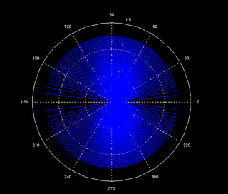 | We know the angle, how about range? Ranging with two microphones is possible, but we must know use more than just the delay. We can range, assuming that the signals are propagating as spherical waves, using intensity difference between the 2 signals. This is possible with the assumption that the intensity decreases proportionally to the inverse square to the source. Unfortunately, this is very sensitive to noise. Also, sound isn't significantly attenuated in the typical microphone radius distance, which makes the intensity difference negligible. Is there a better way to range? There is a better way to range. If we use more than one pair of microphones, we can calculate two separate angles, and use them along with the base distance to triangulate the location of the signal source. An example of code to do this for an array of 4-microphones is here: quadmath.m The increase in the number of microphones and the addition of ranging increases the computation and the complexity of the equations. However, the increase in floating point operations is negligible compared to the number of operations performed to compute shifts. What are the limitations of the 2-microphone system? One limitation of using a 2-microphone system is an effect called "endfire." Endfire occurs along the axis joining the two microphones. Endfire is inherent in the geometry of two-element signal arrays that discretely sample signals. A difference of one sampled shift near the axis can be equal to several degrees of azimuth. Close to the perpendicular bisector of the array, the system becomes more resilient, and azimuth calculation is not impaired in an appreciable manner by small errors. Because endfire is an inherent quality of the array, there is no way of resolving this difficulty without adding more microphones. Here is an example of code that creates every possible source position |