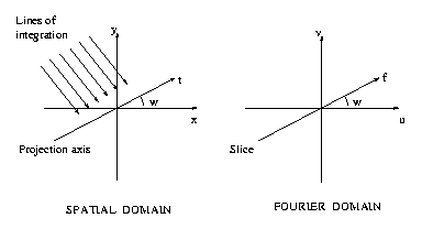 The reconstruction of f(x,y) from our set of projections is based on the Fourier Slice Theorem. This theorem describes the idea that the 2-D Fourier transform of f(x,y) can be found from the set of 1-D Fourier transforms of our projections, g(s, phi). As we have discussed all semester in Elec 301, the simple Fourier transform of our projections, which we will denote as G(phi, w), is as follows: