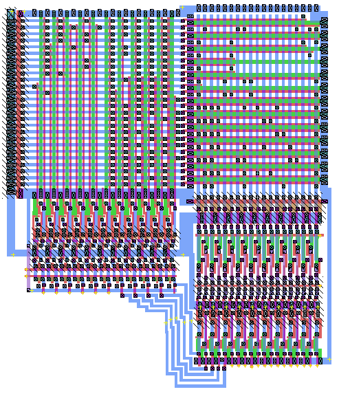 The following image is a screen capture of the magic layout for the FSM. The blue lines which are routed on the outside center of the cell are the state bits. We connected these state bits to output pins for debugging purposes.