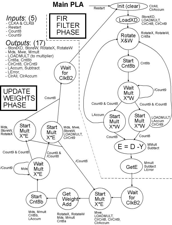 In the initial state (which is reached upon Restart), all of the latches and stack memory regions are cleared such that the system will be initialized properly. The first phase begins after initialization, the FIR filter phase or calculation of the filter output and error. This is done by multiplying the X and W vectors (requiring 8 multiplies) and then taking the difference between the desired signal input D and the sum of X*W, as shown below. Note that two counters are being used here as explained earlier, one to keep track of when a multiply operation has finished (COUNT9) and one to keep track of when the 8 multiply operations have been performed.