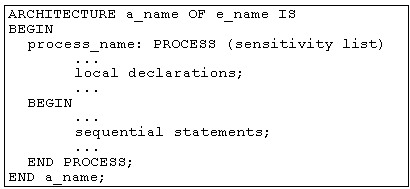 A process statement consists of an optional process name, the PROCESS keyword, an optional sensitivity list, an optional declaration section (e. g. for variables), a BEGIN keyword, a sequence of sequential statements and an END statement. The sensitivity list is required if the process doesn't contain a wait-statement, otherwise the process would be permanently executed and hinder the execution of any other statements. A process with a sensitivity list is only executed when one of the signals in the sensitivity list changes.