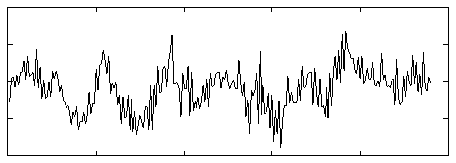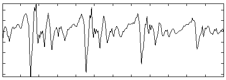 In the figures below, we see the residuals for two typical frames, one voiced and one unvoiced. Clearly, the unvoiced frame is very noise-like, but the periodicities in the voiced residual are not easy to see. Therefore, we compute the autocorrelation of both residuals. In the unvoiced frame, the autocorrelation is near zero except for the spike at Rx(0), as we expect for white noise. However, the autocorrelation for the voiced frame clearly displays the periodicities.