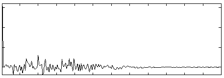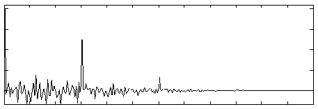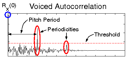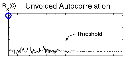 To determine if the frame is voiced or unvoiced, we apply a threshold to the autocorrelation (shown below). Typically, this threshold is set at Rx(0) * 0.3. If no values of the autocorrelation sequence exceed this threshold, then we declare the frame unvoiced. If we have periodicities in the data (as in the second figure), then we should see spikes which do exceed the threshold; in this case we declare the frame voiced. Notice that the distance between spikes in the autocorrelation function is equivalent to the pitch period of the original signal.